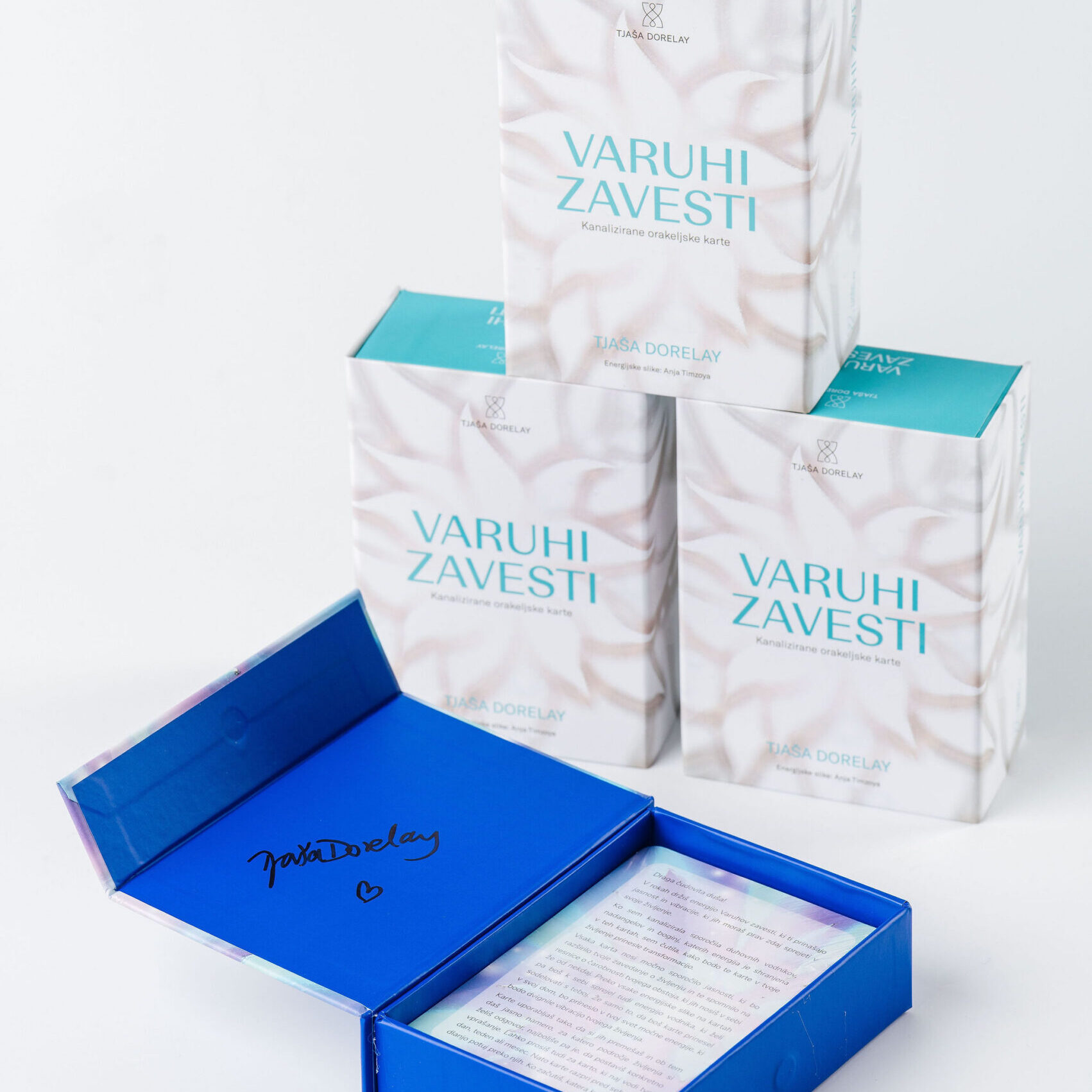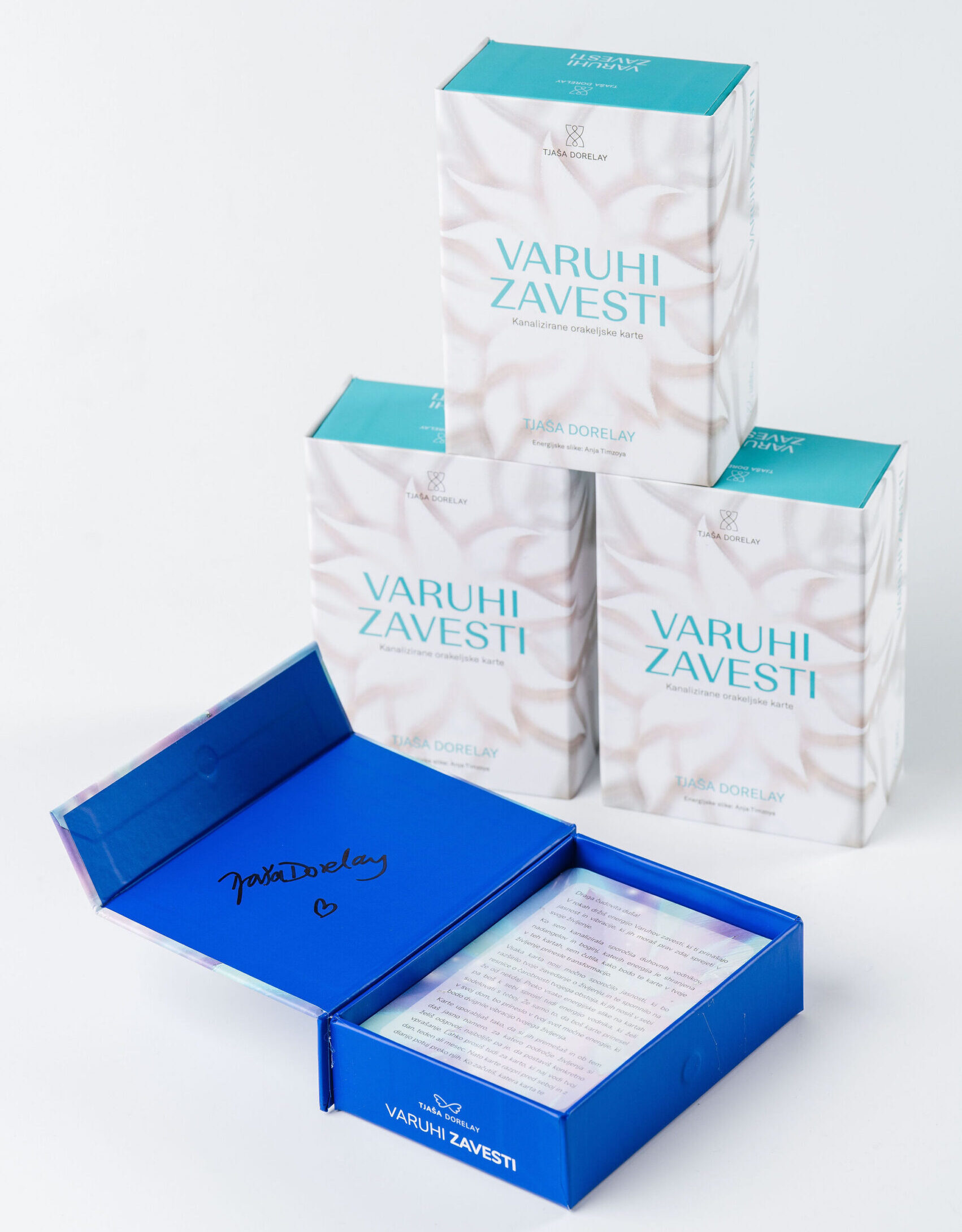 • 1 zbirateljski komplet prve, originalne izdaje orakeljskih kart VARUHI ZAVESTI, podpisan s strani Tjaše Dorelay